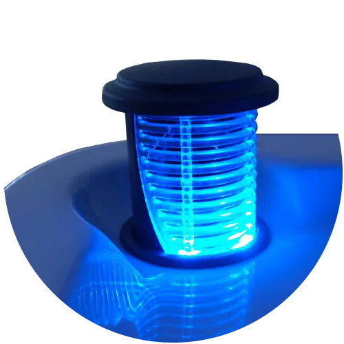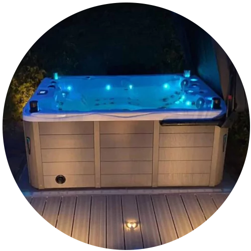 Niedaleko brzegu basenu jacuzzi znajduje się oświetlenie LED (mini LED) w różnych kolorach, które dodaje efektownego wyglądu i atmosfery.